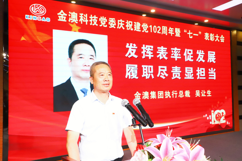 会上,吴总裁以《发挥表率促发展 履职尽责显担当》为主题发表讲话。他表示,公司党委每年都组织召开“七一”表彰大会,目的是进一步引导员工爱国、爱党、爱企、爱家,在工作中充分发挥共产党员的先锋模范带头作用,激发公司各党支部的组织活力,增强广大党员的光荣感、使命感、责任感,促进金澳的各项事业又好又快发展。