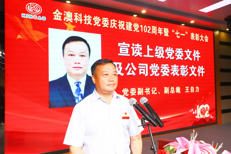 【概要描述】6月29日晚,金澳科技党委在多功能厅召开“党建引领聚合力 真抓实干促发展”——庆祝建党102周年暨“七一”表彰大会。全国优秀共产党员、金澳集团执行总裁吴让生出席会议,金澳科技党委书记、轮值总裁肖生强等党委领导班子成员及非当班党员、预备党员、入党积极分子、管理干部参加。