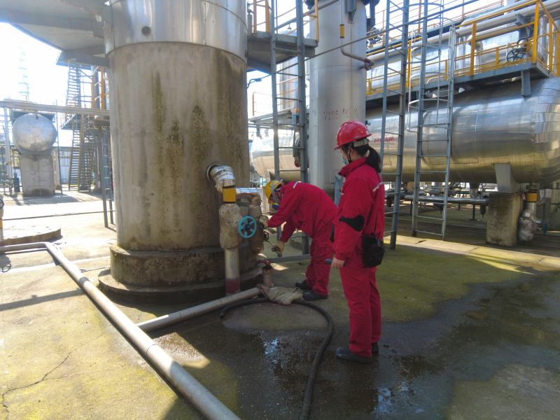 党员、金源化工公司综合科科长何丽,气分车间外操彭凯弦,对气分装置砂滤塔进行切水操作。