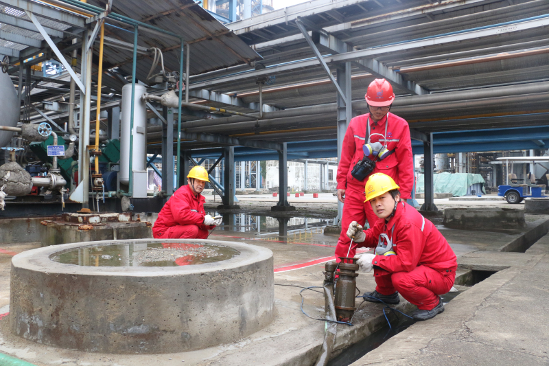 硫磺车间设备管理员肖江晔在老硫磺脱臭剂泵西侧明沟处,配合维修车间人员对潜水泵进行检修,防止明沟污水泄漏。