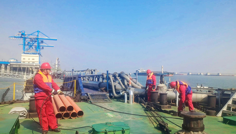 物流公司副总经理谢胜良组织监利油库值班人员对趸船锚链进行紧固调试,确保运输作业安全稳定。