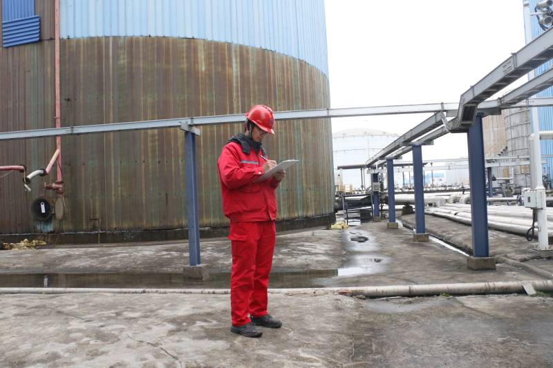 油品储运一公司油品一车间副主任郭勋在罐区查看管道阀门完好性及相关设备运行情况。