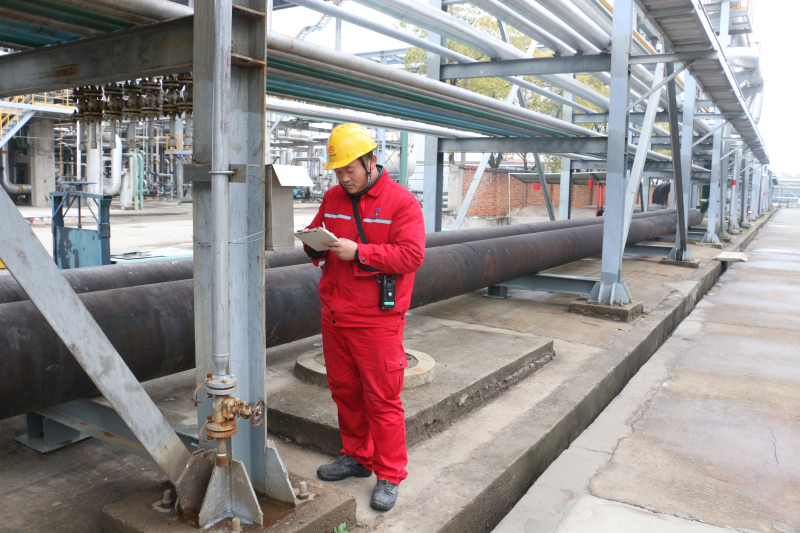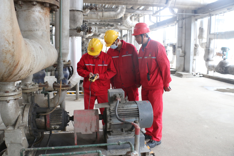 炼化党支部委员、副总经理邵清平对沥青装置稳定二中泵振动值及轴温进行监测,确保生产安全稳定。